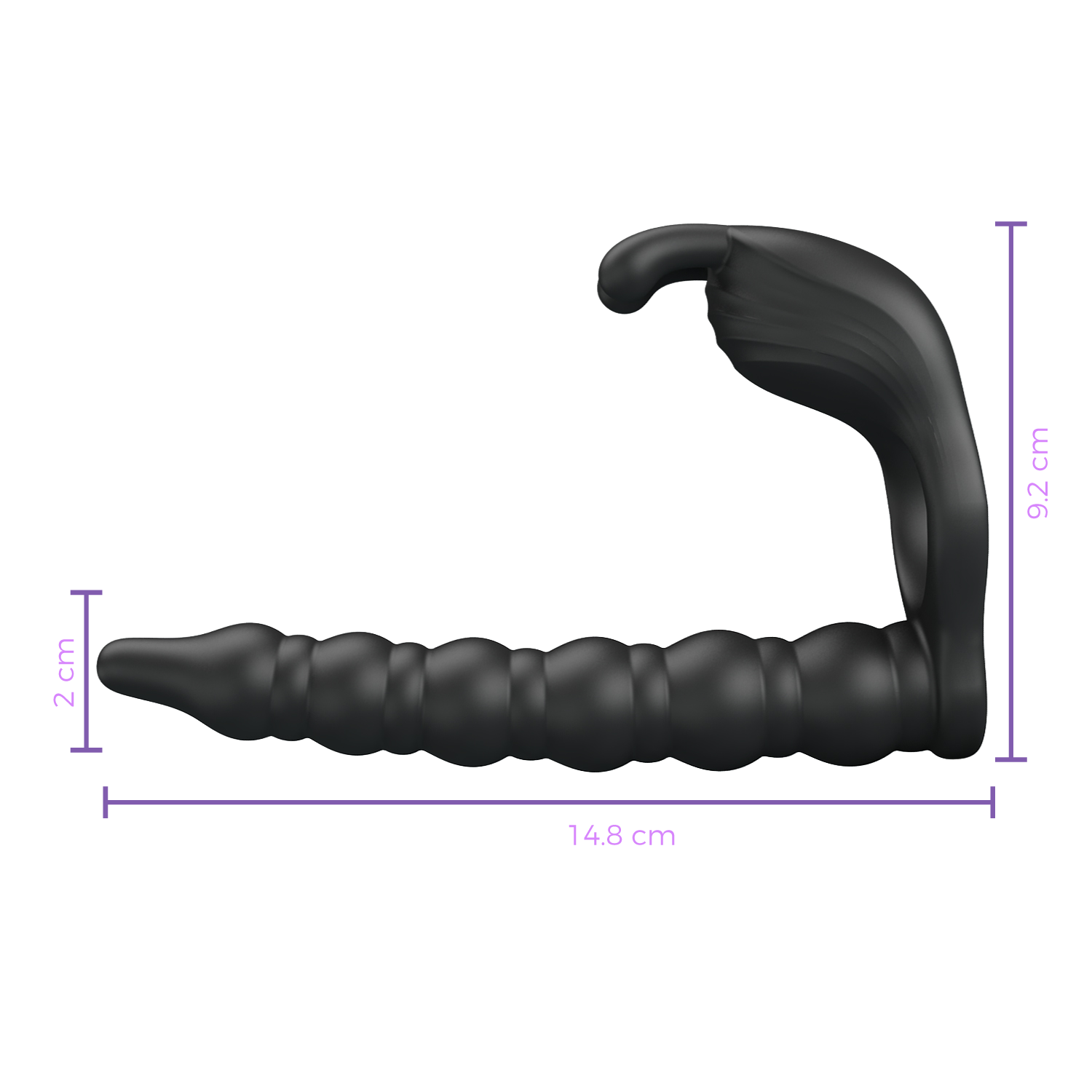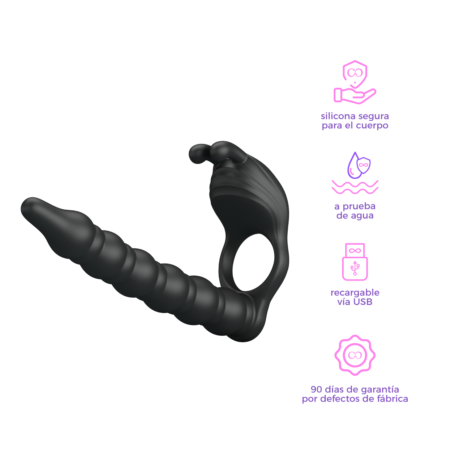 Este modelo combina un anillo que ayuda a mantener la erección por más tiempo y un plug anal integrado, creando una experiencia más completa y envolvente. Además, incorpora un estimulador externo con textura que se enfoca en el clítoris, proporcionando vibraciones directas para intensificar el placer.
