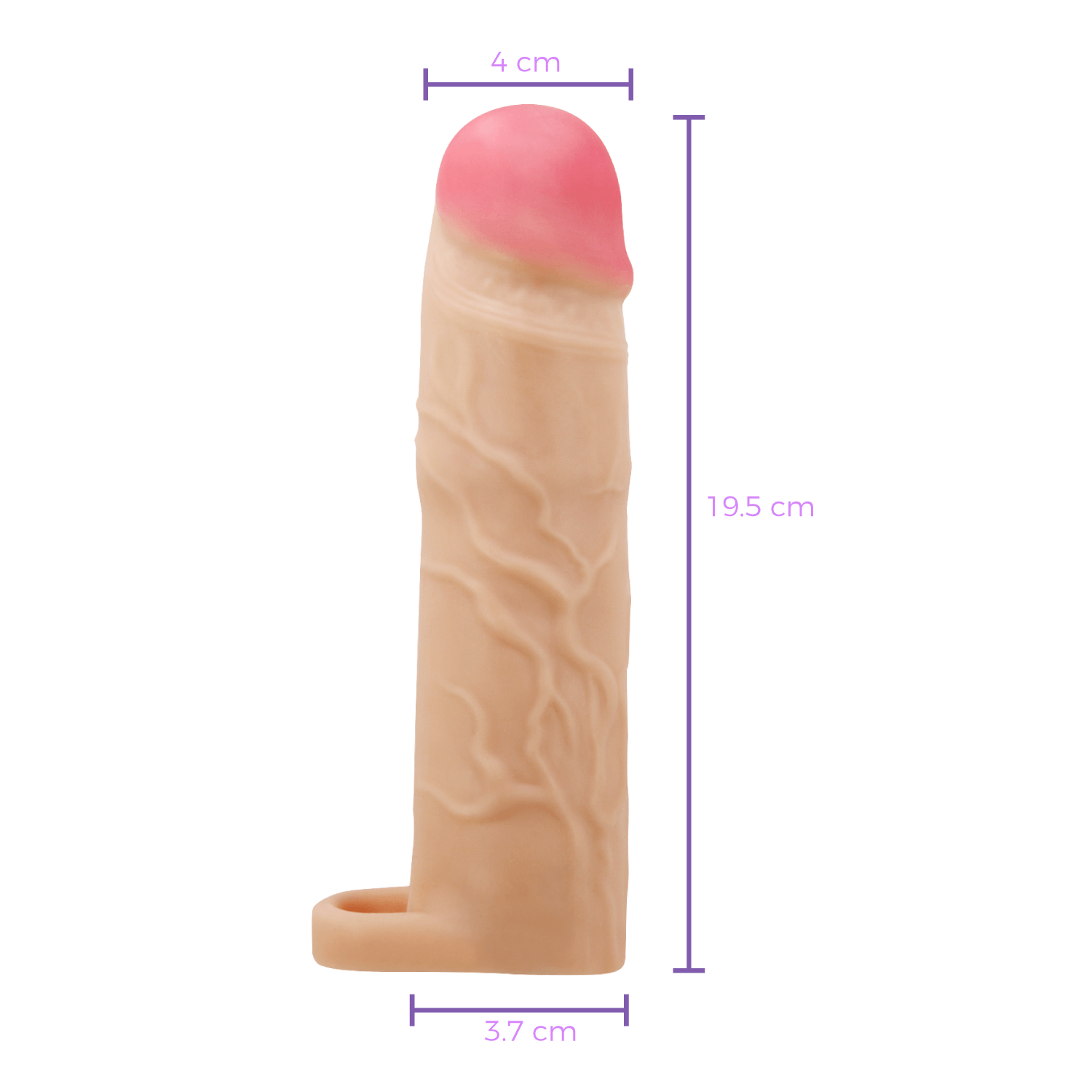 Su diseño permite colocarla fácilmente, aportando mayor longitud y una sensación más envolvente que puede intensificar el placer en pareja. Además, incorpora un sujetador de testículos que ayuda a mantener la funda en su lugar durante el uso.